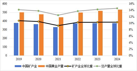 从近几年中国黄金产量看,中国黄金总产量占全球比重呈现提高趋势,由2019年14.16%,提高到14.59%(其中,2021年受疫情影响小幅回落至12.46%);矿产金产量比重维持在10%左右。