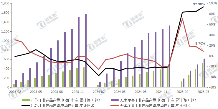 2024年末在“以旧换新”政策的推动下,电动自行车产量迅速增长(2024年江苏省和天津市电动自行车产量分别同比下降21.2%和20.1%),2025年1-5月江苏省和天津市电动自行车产量分别为533万辆和619.95万辆,分别同比增长92.9%和8.7%。这也是导致前五月电动自行车铝消费量同比增长79.19%的原因。