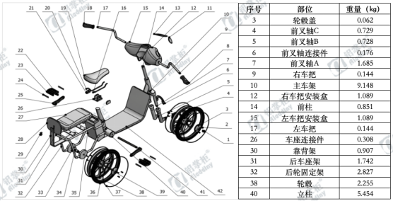 下图为某电动自行车图纸,其中部件用铝量合计为29.338kg。该电动自行车设计中,主要部件如车架、后轮固定架、后车座架等采用了铝6061材料,这种材料具有良好的机械性能和耐腐蚀性,能够有效保证电动自行车的结构强度和耐久性。