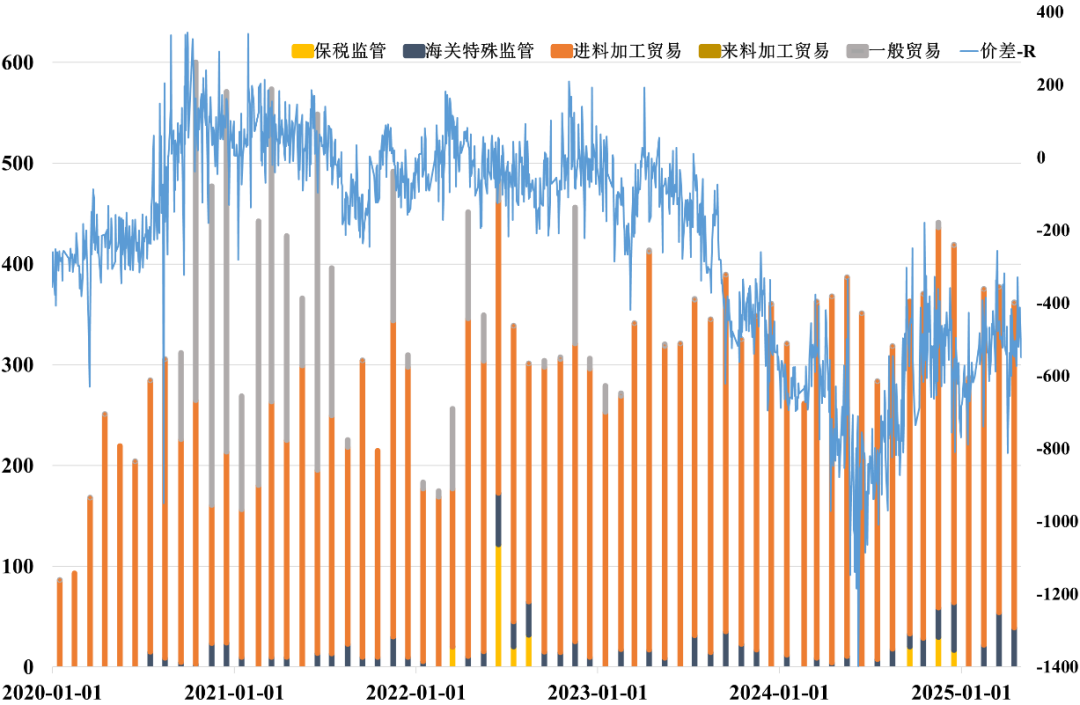图2 银锭分贸易方式出口量vs白银国内外价差(单位:吨、元/公斤)