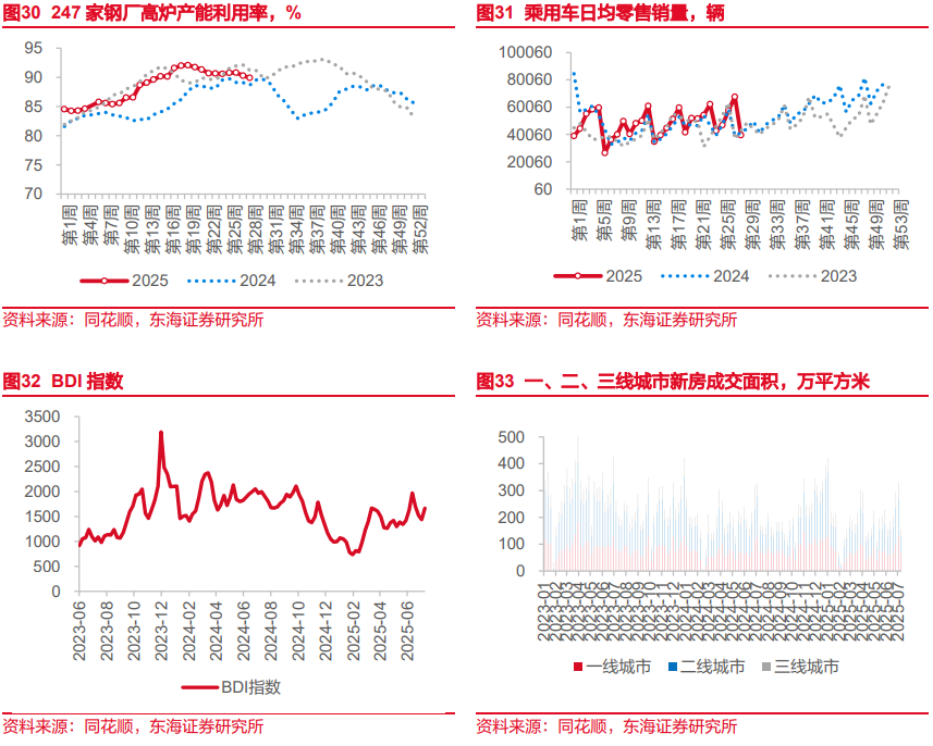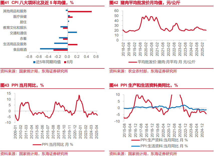 上游价格继续承压,“反内卷”效果初步显现。生活资料环比-0.1%,同比降幅持平前值;生产资料环比-0.6%,仍然是拖累PPI的主要因素,上游价格依然承压。1.高温多雨同样对PPI有一定影响,体现在地产、基建等项目的施工,影响相关原材料需求。2.绿电增加带动能源价格下降,水电等清洁能源发电量季节性增加对火电形成一定替代,影响上游煤炭价格。3.出口占比较高的行业承压,外需下行在价格上有明显的反应。4.“反内卷”在部分行业上逐步兑现,新能源车整车制造价格环比0.3%,同比降幅比上月收窄0.4个百分点;光伏设备及电子元器件制造价格同比-10.9%,降幅收窄1.2个百分点;锂离子电池制造价格同比-4.8%,降幅收窄0.2个百分点。