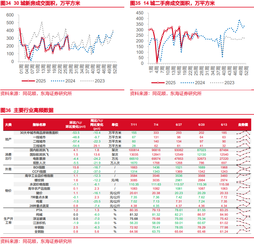 从价的角度,截至7月11日,美国货币市场流动性较为宽松。受美债收益率下降影响,SOFR下降3bp至4.32%。SOFR-IORB和SOFR-FFR利差分别同步下调至-8bp和-1bp。同样,货币市场方面需要关注三季度美债发行计划以及稳定币发量规模。若稳定币热度再次发酵,发量规模超预期增长,或会挤压银行可贷资金基数,导致货币市场利率上升。房地产方面,住房抵押贷款利率结束了连续5周的下降,30年期和15年期分别提高了5bp和6bp至6.72%和5.86%,呈现出回暖的态势。