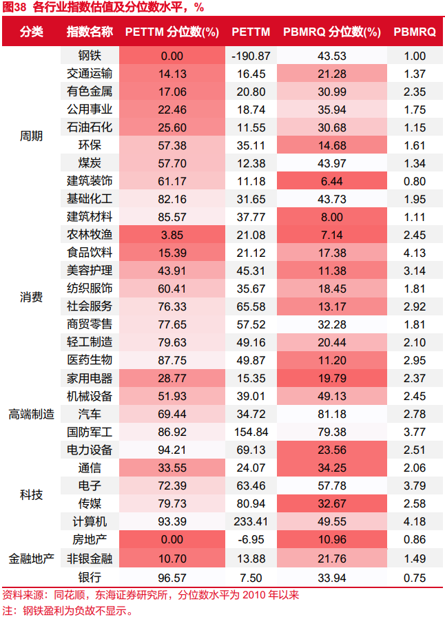 主要行业估值(PE)分位数水平:周期:交通运输<有色金属<公用事业。消费:农林牧渔<食品饮料<美容护理。高端制造:家用电器<机械设备<汽车。科技:通信<电子<传媒。金融(PB):房地产<非银金融<银行。