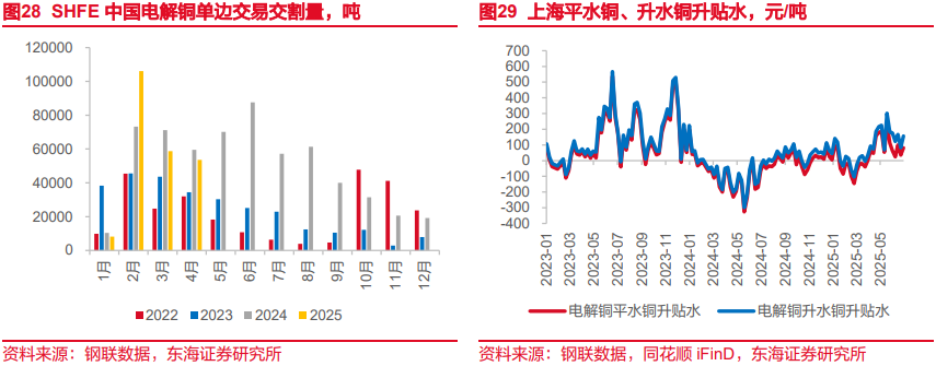 2025年7月11日当周,我国SHFE电解铜持仓量为193127.4手,环比降低12.2%,本周持仓量下降;成交量为19844.5手,环比上升4.7%,电解铜的市场持仓交易成交情绪增幅明显。宏观面不确定性加剧,上期所铜库存阶段性回升,保税区库存维持低位,现货升水转贴水。2025年5月,沪铜单边交易交割量为50825吨,低于去年同期交割水平。主要原因是2025年开始,升贴水下跌,现货铜价格相对期货价格走低,期货价格与现货价格趋于一致,市场参与者在现货市场交易数量变多。长期交割量持续下降或将导致基差进一步扩大。