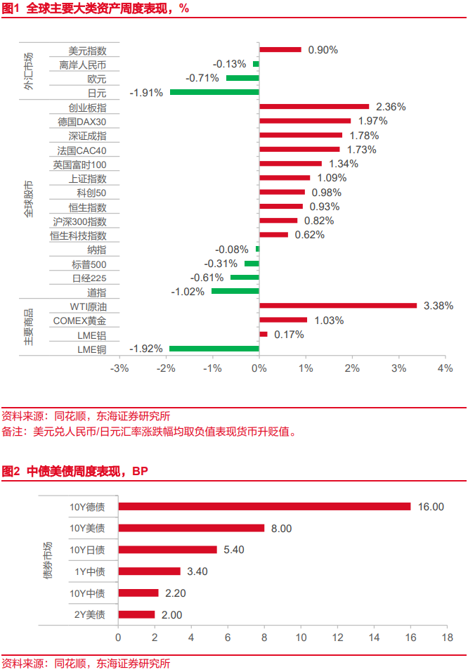 全球大类资产回顾。7月11日当周,全球股市涨跌不一,A股、欧股表现较好,美股下跌;主要商品期货中原油、黄金、铝收涨,铜收跌;美元指数上涨,非美货币贬值。1)权益方面:创业板指>德国DAX30>深证成指>法国CAC40>英国富时100>上证指数>科创50>恒生指数>沪深300指数>恒生科技指数>纳指>标普500>日经225>道指。2)原油、黄金因市场避险情绪升温与关税政策升级影响,当周上涨。3)工业品期货:南华工业品价格指数上涨,炼焦煤、螺纹钢小幅上涨,水泥、混凝土小幅回落;高炉开工率环比下跌0.31pct;乘用车日均零售3.97万辆,环比下跌41.46%,同比上升1.00%;BDI环比上涨15.8%。4)国内利率债收益率收涨,全周中债1Y国债收益率上涨3.4BP至1.3702%,10Y国债收益率上涨2.2BP收至1.6653%。5)美债收益率继续上行。2Y美债收益率当周上行2BP至3.90%,10Y美债收益率上行8BP至4.43%。6)美元指数收于97.86,周上涨0.90%;离岸人民币对美元贬值0.13%;日元对美元贬值1.91%。