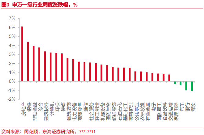 国内权益市场。至7月11日当周,风格方面,成长>金融>消费>周期,日均成交额为14762亿元(前值14153亿元)。申万一级行业中,共有27个行业上涨,4个行业下跌。其中,涨幅靠前的行业为房地产(+6.12%)、钢铁(+4.41%)、非银金融(+3.96%);跌幅靠前的行业为煤炭(-1.08%)、银行(-1.00%)、汽车(-0.41%)。
