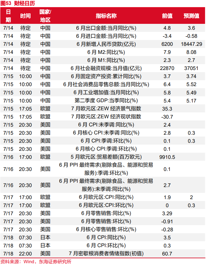 3)新的一周主要经济数据与市场预期。新的一周,正值半年报业绩披露期,美国或将继续通知包括欧盟在内的各国新的关税税率;与此同时,美国主要银行将发布财报。美国6月份的CPI报告将成为重要参考,以寻找关税对通胀影响,其余主要指标包括密歇根州消费者调查、零售额数据、FOMC主要成员的讲话等。在英国,市场将关注关键的通胀和就业数据,年通胀率预计将稳定在3.4%。在德国,ZEW经济景气指数预计将改善;欧元区工业生产在经历了近两年来最大幅度的下滑后,预计将出现反弹。中国国内,将发布一系列经济数据,其中包括贸易数据、GDP、工业生产和零售销售等。在日本,市场将密切关注即将公布的贸易数据,因为美国将于8月1日对日本出口征收25%的关税,其余主要经济数据还包括通胀数据和核心机械订单等。