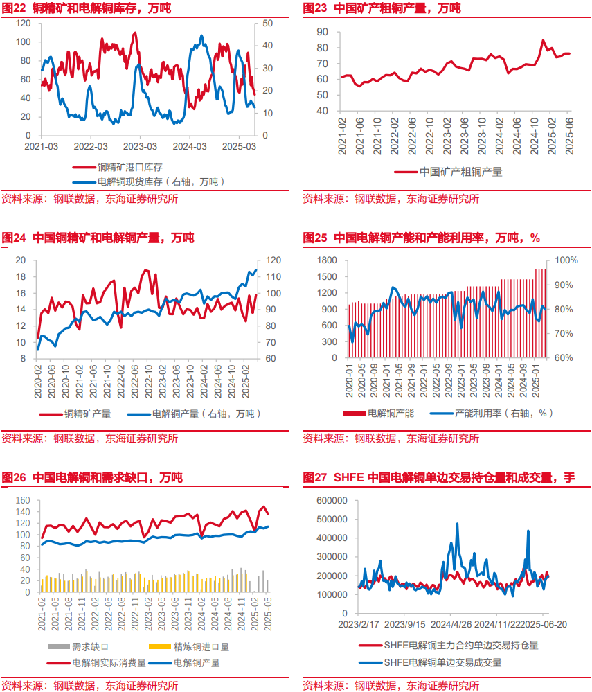 2025年5月,我国电解铜产量约为114.17万吨,环比增长2.9%,同比增幅16.3%,生产能力复苏水平较上期增长明显,下游需求维持旺盛状态。2025年5月,我国电解铜产能为1648万吨/年,产能利用率为82.25%。2025年5月我国电解铜产量和需求缺口约为21.52万吨,缺口较上期同比缩减,供给能力增强。我国进口电解精炼铜数量基本可以覆盖生产需求缺口。