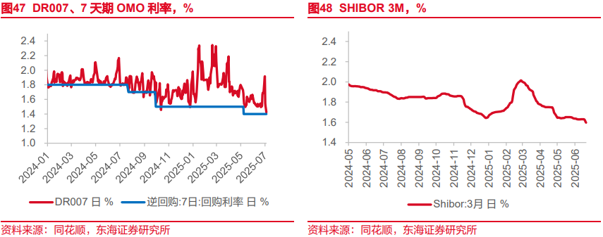 7月11日当周,同业存单到期规模上升(到期5213亿元,前一周为2767亿元)、政府融资力度边际提升(净融资2961亿元,前一周为2084亿元)。以上对流动性的紧缩效应可控,央行OMO亦连续第二周净回收(周内共回收2265亿元,前一周为1.38万亿元)。操作节奏前紧后松,以熨平市场波动。短期资金利率触底后略有回升,DR001加权均价区间为1.31%-1.34%(前一周1.31%-1.51%),DR007加权均价区间为1.46%-1.49%(前一周1.42%-1.92%)。本月7000亿元(3个月期)与5000亿元(6个月期)买断式逆回购到期,而央行未像6月那样在上旬续作,中长期资金利率边际转紧。1M、3M、6M、1Y收益率分别收1.52%、1.56%、1.61%、1.63%,周内分别上行1.95bp、4.08bp、3.49bp、3.78bp。