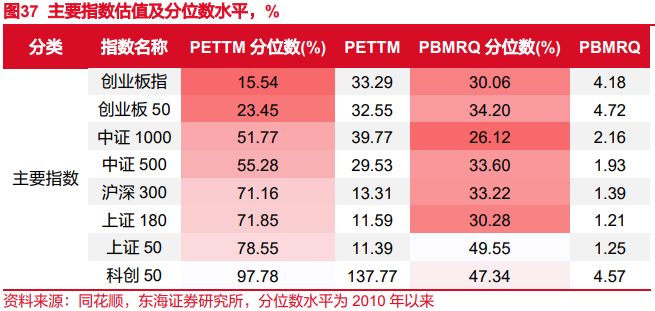 主要指数估值(PE)分位数水平:创业板指<创业板50<中证1000<中证500<沪深300<上证180<上证50<科创50。