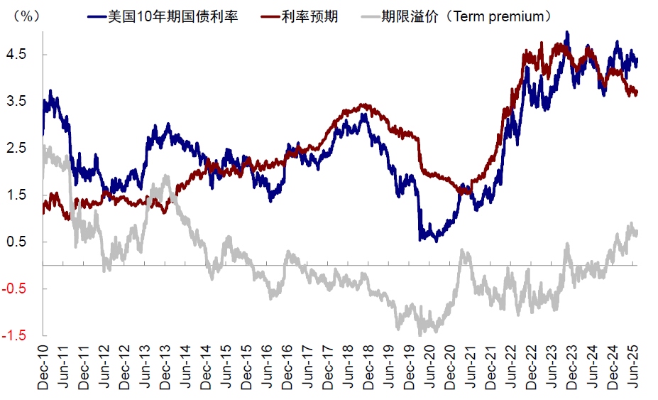图表:2023年三季度债务上限解决后,10年美债期限溢价带动名义利率抬升120bp