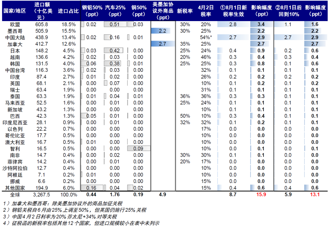 3) 进口份额若包含加拿大、墨西哥以及欧盟则近七成:前两批公布的22个国家中,除日本(4.5%)、韩国(4.0%)占美国进口份额较高,大部分国家占美国进口份额小于0.1%,因此加权后对美国有效税率影响可“忽略不计”。但若包括加拿大(12.6%)、墨西哥(15.5%)以及欧盟(18.5%)的关税变化,涉及美国进口份额占比将显著由21%增加至67%,我们测算该变化也将由当前仍处豁免期内的有效税率抬升3ppt。