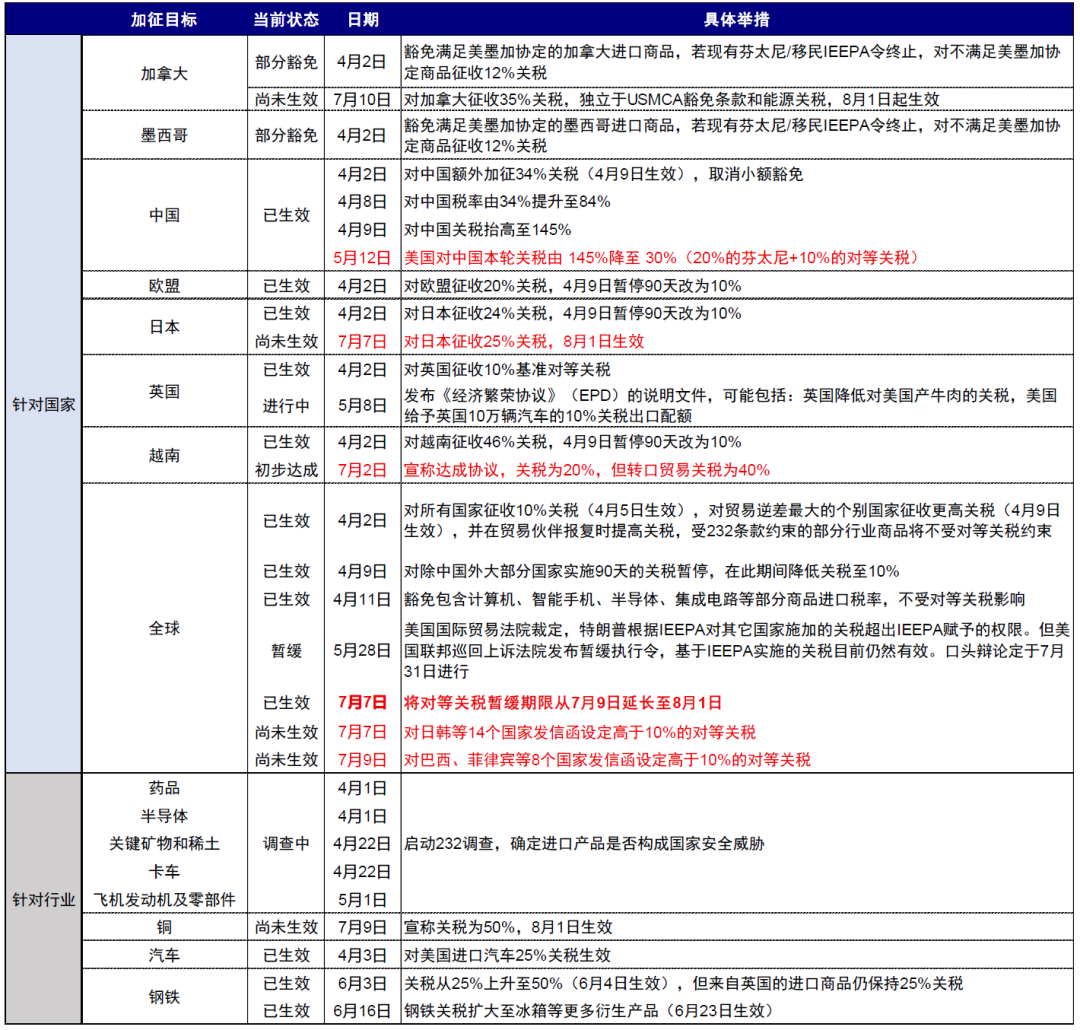 1) 时间变相延后:自4月以来,除了越南[1]和英国[2]与特朗普政府达成贸易协议外,美国与其他贸易伙伴的谈判并未如期完成,因此谈判截止日期也由7月9日“变相”延长至8月1日。