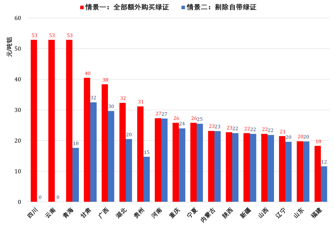 情景一:假设所有电解铝厂都通过市场化交易方式购买绿证以满足绿电消费比例要求,即不考虑使用“自带绿证”电量的情形,代表着电解铝行业绿证最大的购买需求。