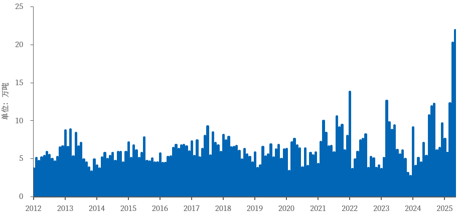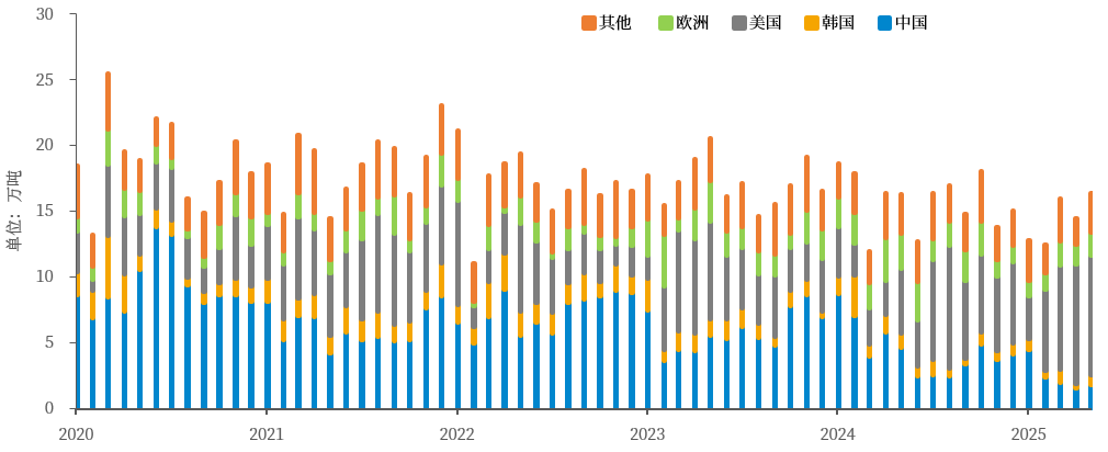 分项来看,今年美国进口铜的增量自3月之后开始显现,增量主要来源于智利(20.7万吨)及刚果(6.1万吨),分别贡献约54%、16%。若从智利海关的出口数据来看,1-5月智利精炼铜出口量约为72.2万吨,其中向美国出口约35.4万吨,同比增加19万吨,向中国、韩国出口分别为12.3万吨、3.3万吨,同比减少约18万吨、4万吨。因此,套利窗口的打开使得更多智利铜运往美国,从而牺牲了部分本应出口至亚洲的份额。而根据我国的海关数据来看,1-5月我国进口电解铜约为134.6万吨,其中来源于刚果(金)约为52.7万吨,同比减少约1.8万吨,而上半年刚果(金)产量增量约为4.4万吨,基本能与美国进口增量完全匹配。因此,在关税预期未落地前,现货贸易流的套利空间使得非美地区可流通的电铜均流入美国。