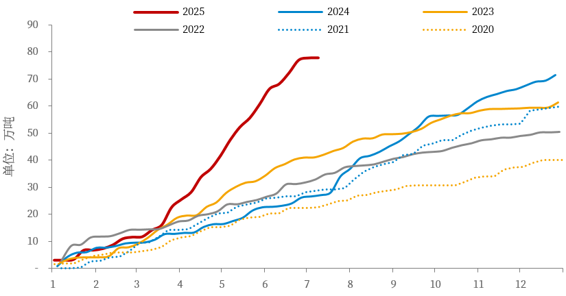 根据美国海关数据,今年1-5月美国精炼铜进口量约为68万吨,同比增加38万吨。根据美国进口铜到港数据,截至7月初,美国已到港电铜约78万吨,而正常年份下,美国每年进口精炼铜约为70-90万吨,当前的进口量已相当于美国往年全年水平,足以满足全年需求。