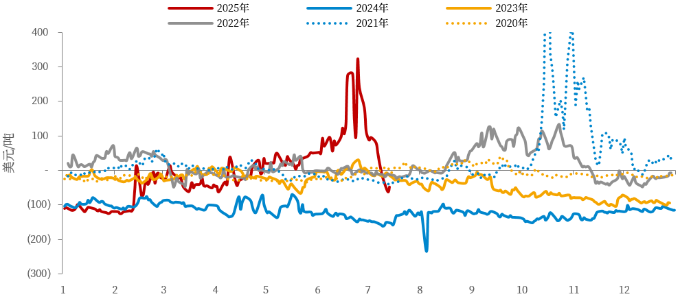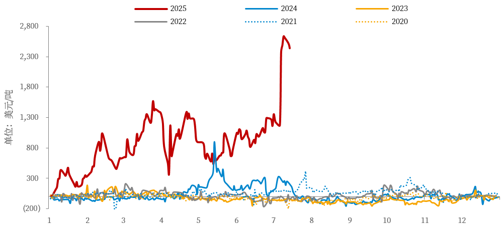 近日,特朗普突然宣布铜行业关税,即美国将对进口铜征收50%的关税,于2025年8月1日生效。消息一经发布,COMEX铜价快速上涨至近5.896美元/磅,再一次创下历史新高。对应地,美伦价差在短时间内快速走扩至超3100美元/吨,对应31.5%的幅度。此后,伴随市场情绪缓和,CL价差逐渐回落至2500-2600美元/吨,计价约26%-27%的幅度。