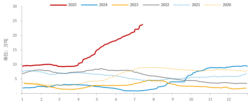 再往后看,当前铜关税提前落地,其最直接的影响便是此前因关税预期带来的套利机会将不再存在,而对应的贸易流将随之结束,此前LME及国内铜现货呈现的供需阶段性紧张也将逐步缓解,COMEX铜的累库步伐伴随7月货物到港后而终止。