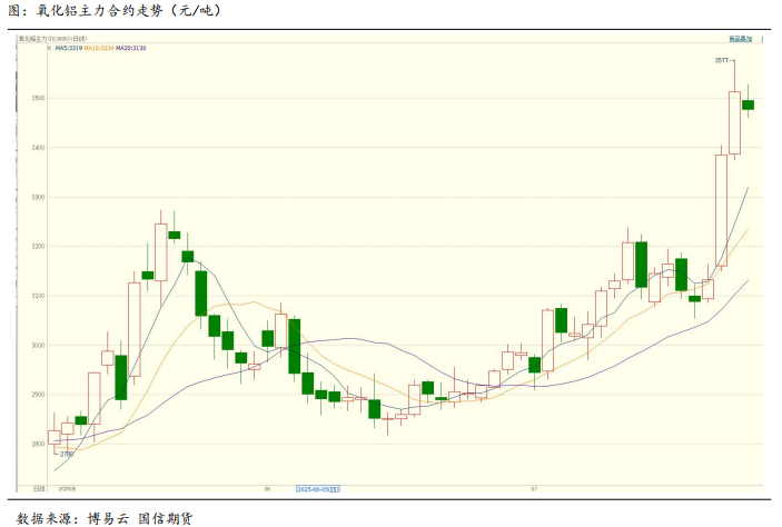 氧化铝期货近期呈现强势上攻态势。主力合约AO2509于7月18日夜盘涨幅超6%,突破3300元/吨关键阻力位,并于7月22日触及3577元/吨的阶段内的新高。截至7月22日收盘,氧化铝主力合约2509收于3513元/吨,较7月18日收盘价上涨12.13%,氧化铝期货合约整体近强远弱的结构较为稳固。本轮上涨伴随持仓量显著增加及成交量放大,显示出资金情绪的高涨。而上涨背后的逻辑则在于多行业“反内卷”带来的结构性利好政策预期以及期现货可交割资源的相对紧张,共同构成氧化铝较强的利多驱动题材。