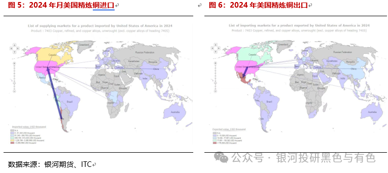 2024年美国进口精炼铜92.6万吨,前三大进口来源国分别是智利、加拿大、秘鲁,进口量分别为65万吨/或占比70%、15.4万吨/或占比16.6%、6.3万吨/或占比6.8%。2025年受232关税政策的影响,1-5月美国进口精炼铜68万吨,假设6、7月平均按照20万吨进口,美国进口总量将达到108万吨,超过往年一整年的进口量,年内进口量将大幅减少甚至停止进口,智利、加拿大、秘鲁的精炼铜或发往非美地区。