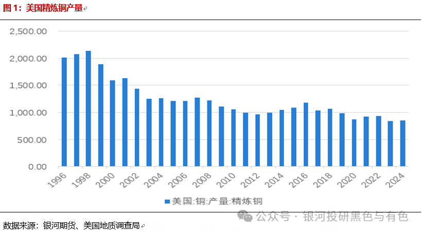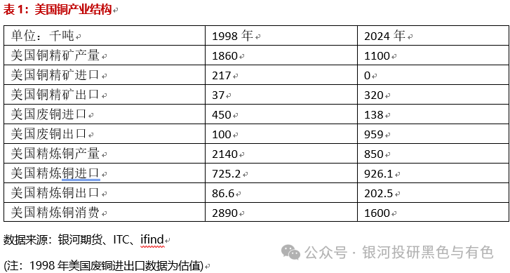 从美国铜的产业结构来看,美国的主要矛盾点不是铜元素供应不足,而是冶炼产能倒退。我们以电解铜产量最高的1998年和2024年对比看一下美国铜供需结构的改变。