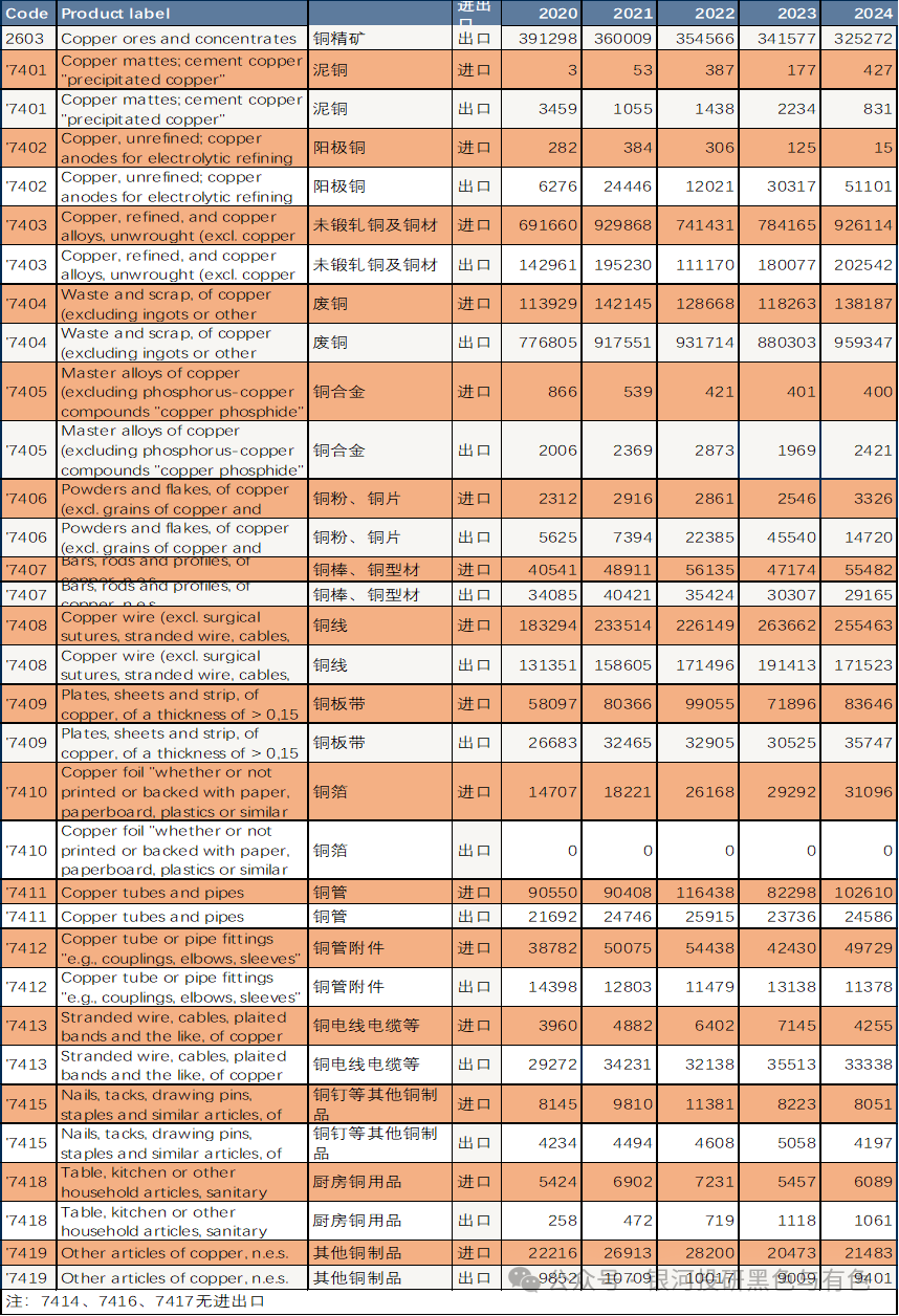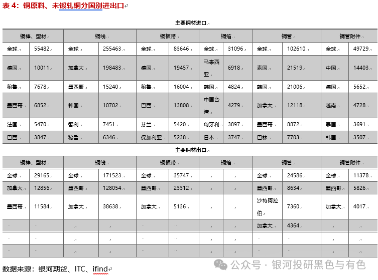 铜材的进出口数据较为分散,我们以ITC中的7907-7912主要产品进行分类汇总,2024年美国进口铜材总量57.8万吨,出口总量27.2万吨。进口来源国较为分散,出口则集中在加拿大和墨西哥两个国家。