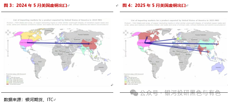 ITC统计数据显示,2024年美国出口废铜95.9万吨,其中出口到中国39.7万吨/或占比40%,加拿大10.4万吨,泰国9.5万吨,印度7.4万吨,马来西亚7.2万吨。中美互加10%的对等关税后,美国4、5月的废铜出口量分别为7.8和8.9万吨,并没有减少,但出口流向发生了转变。泰国、印度一跃成为前两大进口国,5月进口量分别在1.82万吨和1.5万吨,较去年平均水平增加1万吨和0.88万吨,加拿大、日本、比利时等国进口废铜量也出现不同程度的增长,而中国从美国的进口量骤降到0.15万吨。从出口金额上来看,出口排名前五的分别是加拿大、日本、比利时、泰国、印度,与出口量存在明显的差别,这主要是由于加拿大、日本、比利时环保要求较高,以进口高品位废铜为主,泰国、印度则以进口低品位废铜为主。