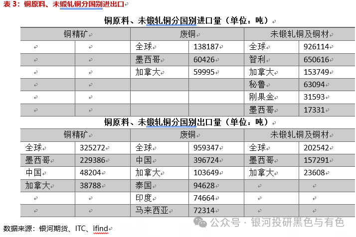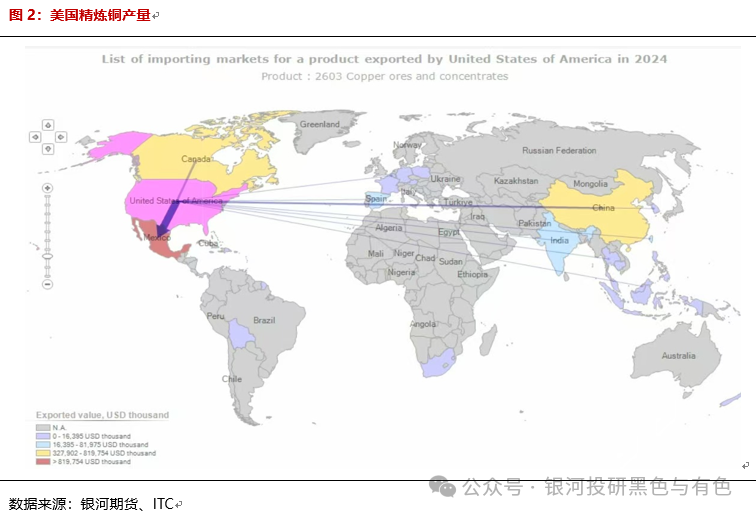 2024年美国铜精矿产量为110万吨,出口32万吨,主要出口到墨西哥、中国、加拿大,其中出口到墨西哥22.9万吨,占比高达71.6%,出口到中国和加拿大的量分别在4.8万吨和3.9万吨。美国基本不进口铜精矿,受到232关税的影响较小。