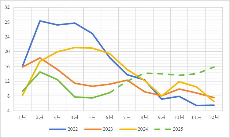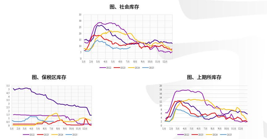 海外而言,近期持仓集中度过高是锌的一个风险点。从长期逻辑来讲,4月确定的海外矿端加工费Benchmark较低,冶炼厂长期处于低利润状态,对能源成本变动较为敏感,Nystar澳洲炼厂已削减25%的年产能,欧美冶炼厂亦存在减停产风险。另一方面,今年海外锌矿产量稳步提升,海外部分炼厂减产后更多的锌矿流往国内,在4-5月进口窗口部分打开后,我国锌矿进口量环比大增,对我国矿端原料形成较大补充的同时,也在港口积累了不少的待点价头寸,并在6月进口窗口关闭后出现囤积。而同样由于二季度伊始进口窗口的短暂开启,海外部分贸易商开始转运LME库存至国内,在这过程中出现了较多的锌锭库存隐性化,LME持仓集中度一度高至89%,因此于7月中旬出现了多头投机的反复情绪。纵观全年,我们认为海外锭端扰动风险仍存、欧洲财政开支扩张的情况下,LME锌锭库存较难出现趋势性累库。策略方面,我们在4月《锌:偏空思路不变,关注内外正套》提到的内外正套策略已得到验证,内外正套可谨慎持有。