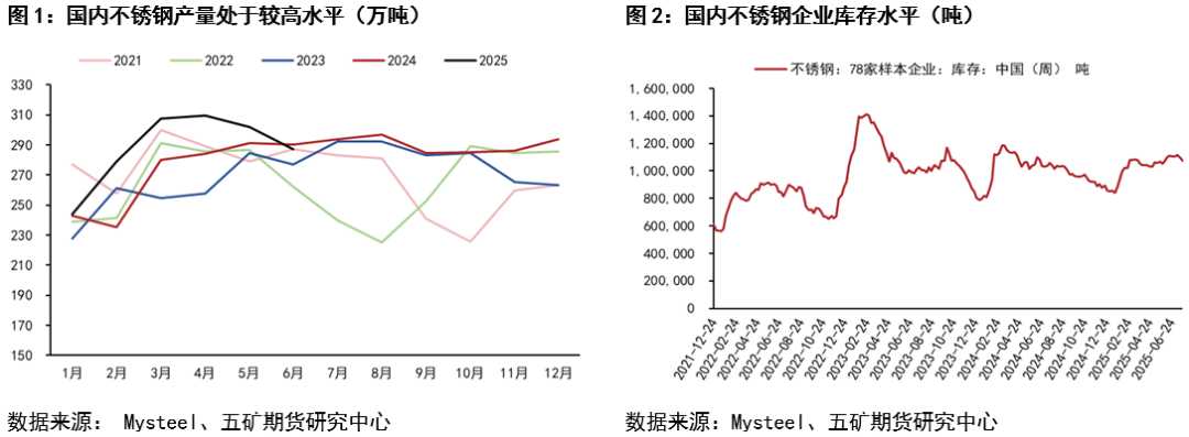 短期来看,引发不锈钢价格反弹的现实路径在于投机需求对于需求端的短暂改善。近期不锈钢价格回升背景下,市场出现部分投机需求,导致不锈钢库存短期小幅去化。但应该认识到,不锈钢库存依旧处于较高水平,这将限制价格向上的弹性。截至2025年7月17日,全国主流市场不锈钢89仓库口径社会总库存为114.8万吨,周环比减少1.69%。社会库存消化速度依旧缓慢,且从历史数据来看,当前库存仍处于相对高位。供给方面,虽然7月存在一定减产预期,但减产力度整体仍不及预期。7月份全国43家不锈钢厂预计排产量为326.8万吨,环比减少0.7%,同比减少1.2%。因此,在库存高企、供给未见大幅收缩的背景下,我们对本轮反弹高度依然较为悲观。
