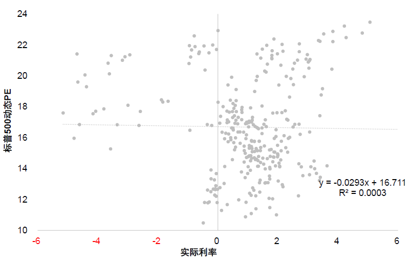 图表:标普500的12个月动态P/E与实际利率呈负相关关系,但相关性很低