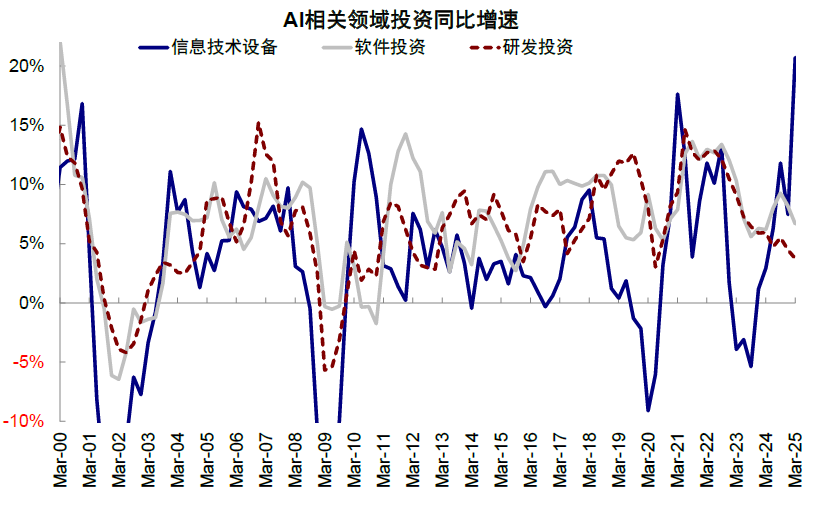 图表:2025年一季度AI相关领域加速投资,信息技术设备同比增速升至21%