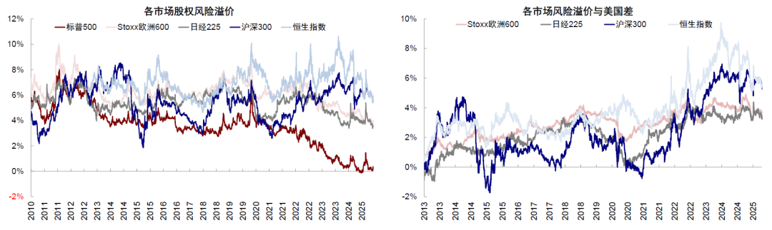 若采用这个约定俗成的计算方式,当前美股的风险溢价远低于世界其它主要市场,标普和纳指的风险溢价分别为0.36%和-0.6%,而全球其它主要市场中欧洲Stoxx600和日经225的风险溢价分别为4.0%和3.6%,沪深300和恒指的风险溢价则分别达5.6%和5.9%。