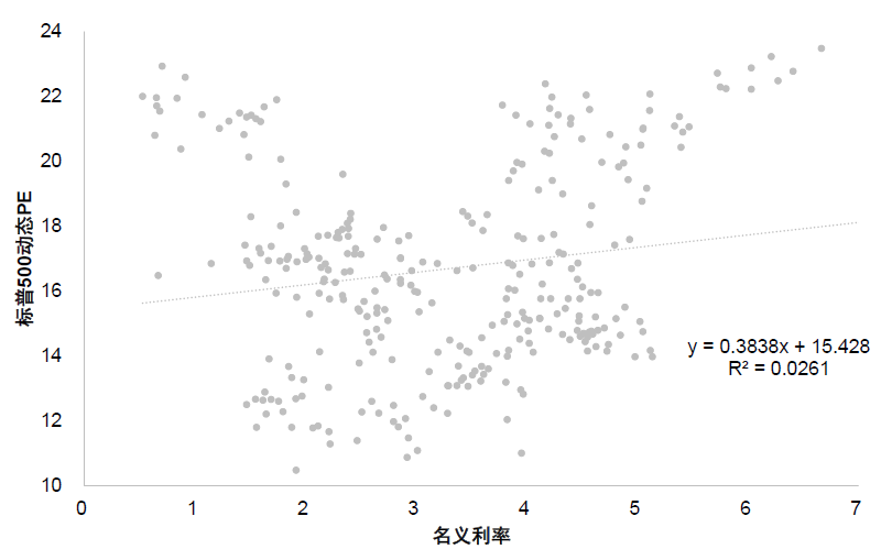 图表:标普500的12个月动态P/E与名义利率呈正相关关系