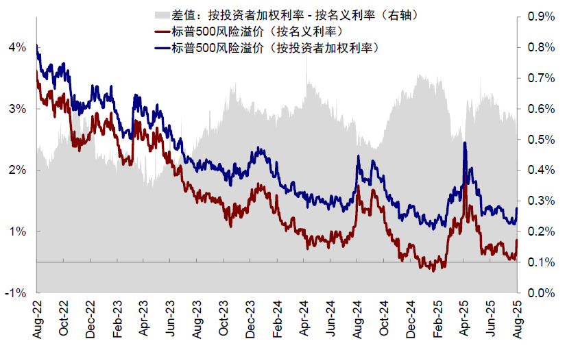 考虑到近几年全球“资产荒”,普遍缺乏有吸引力的投资机会,全球资金大量涌入美股,美联储口径(数据截至2025年一季度)2022年底以来海外投资者持有美股规模增加5.2万亿美元,美国财政部TIC口径(数据截至2025年5月)这一规模达6.6万亿美元,贡献这段时间美股市值增量的39.1%。与此同时,海外投资者持有美股规模占美股总市值[1]的比例也从2022年底的27.4%抬升至32.1%(截至2025年5月)。考虑到不同的海外投资者投资美股时面临的无风险回报都不相同,我们认为应该按照投资者增量结构的加权利率而非单纯美债名义利率计算风险溢价,就像内地投资者投资中国香港市场要求的风险补偿要同时考虑中国和美国的无风险利率加权平均一样。