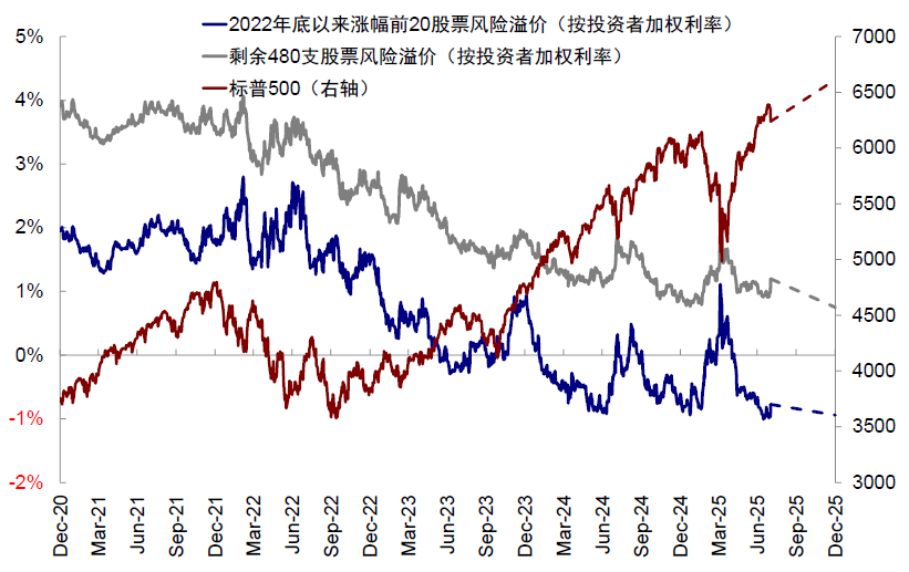 从风险溢价看,2022年底以来涨幅前20股票的风险溢价(当前为-0.8%,按海外投资者结构加权利率计算,下同)明显低于其它480支(1.2%)和标普500整体水平(0.9%)。对等关税后,这20只股票的风险溢价相比标普500继续扩大(与标普风险溢价之差由4月3日高点的-0.8%扩大至当前的-1.6%),而剩余480只股票风险溢价相对标普500则明显上行(与标普风险溢价之差由4月3日低点的0.1%抬升至当前的0.3%),证明近期美股风险溢价的修复主要来自这20支股票的贡献。