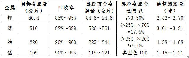 (1)理论测算:对“国标”(锂≥6.5%,镍钴总量≥25%)再生黑粉进行估计,需求下限2.8吨,上限3.3吨。
