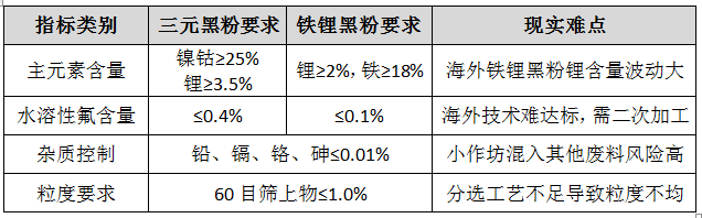 一是环保达标难度较大。“国标对水溶性氟含量的要求高,目前国内、外能达到的企业还不多”,一位业内专家接受访谈时谈到。海外黑粉因分选技术不足,氟含量常超标,无论是海关检测还是境外建厂分选,都需要投入大量成本;若处理不当,易腐蚀设备、污染环境,增加末端治理成本。