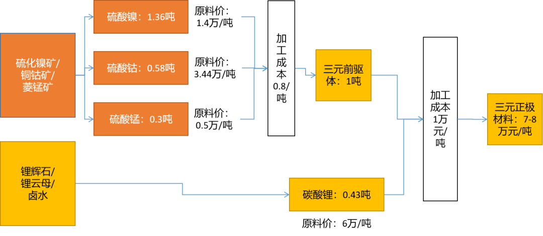 由图可知,在原矿来料生产流程下,三元正极材料的生产成本(原料成本+加工成本)约为7万-8万元/吨,扣除加工成本,原料成本约为6万-7万元/吨。