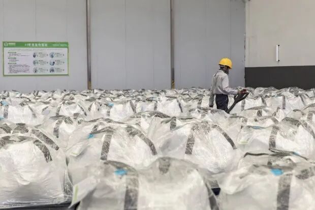 宁德时代(CATL)在中国的一家工厂里,成袋的锂。贸易商们一直在等待锂供应的大幅减少。