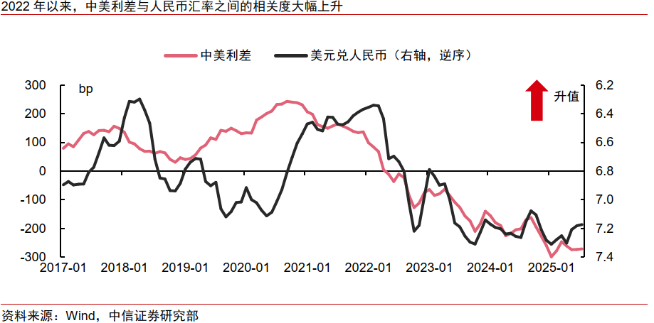 2022年之前,中美经济周期和通胀周期同步性都较强,利差也相对稳定,且中国国债利率高于美国国债利率。这一时期中美利差和人民币汇率的相关性很弱。但是2022年之后,中美经济周期和通胀周期明显分化,美国利率大幅上升,中美利差开始倒挂,而且波动幅度更大。利差大幅变动使得金融项下的资金波动强度超过贸易项,利差开始成为人民币汇率定价的主导因素。