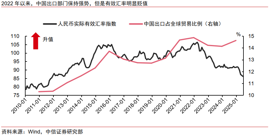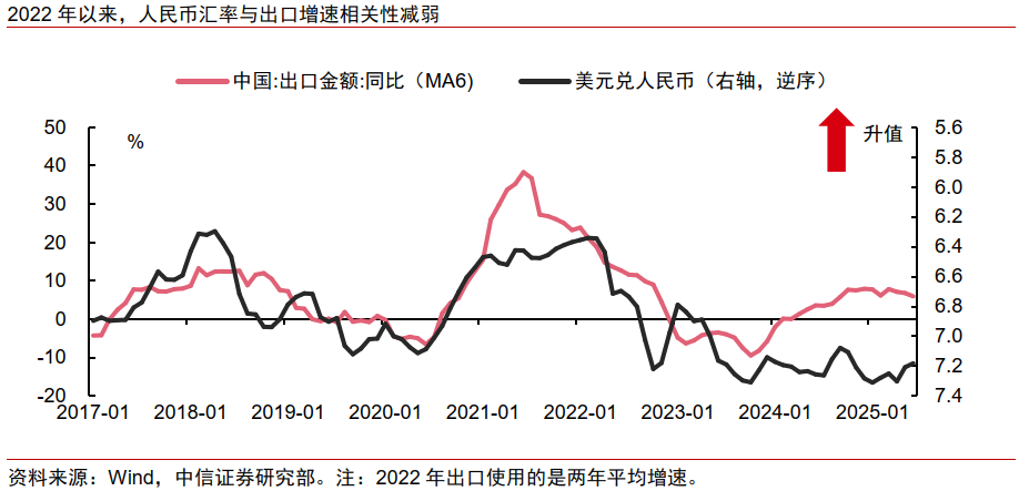 ▍这是2022年后人民币汇率定价范式转变的结果,2022年之前人民币汇率隐含了“出口-汇率”自动平衡机制,但2022年人民币有效汇率下降不断强化中国出口竞争力。