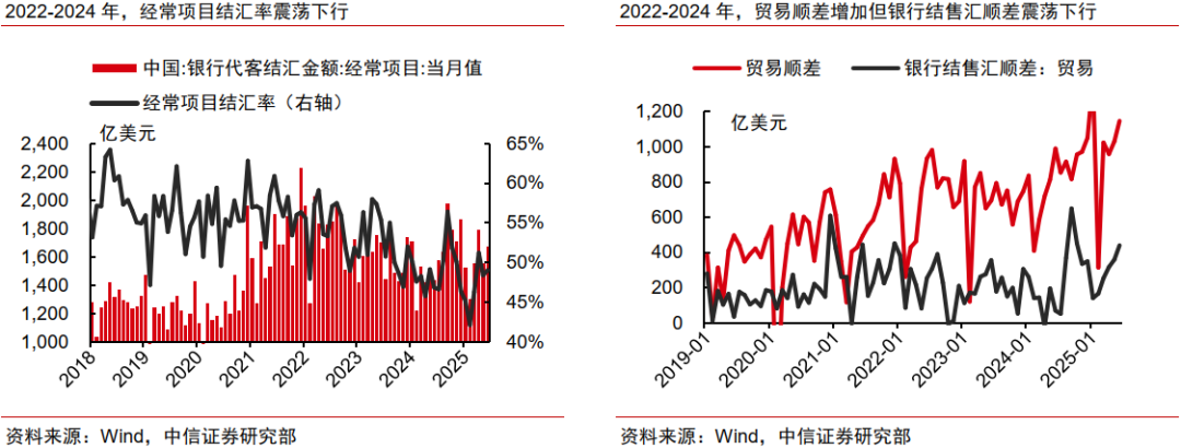▍人民币汇率定价范式转变的第二个原因是出口企业结汇率偏低,导致贸易顺差没有完全转化为资金流入。