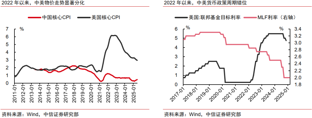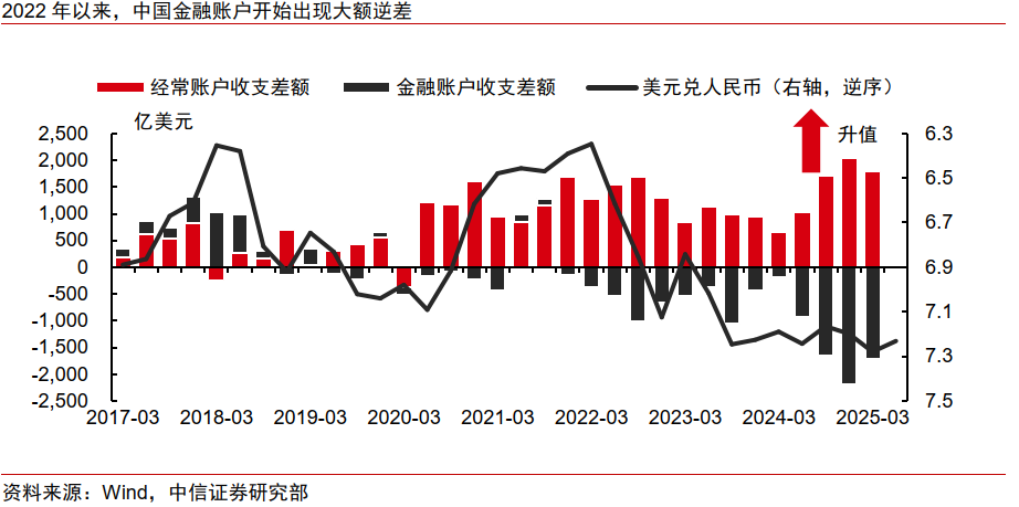 ▍人民币汇率定价范式转变的第一个原因是中美经济周期和通胀周期分化,导致中美利差倒挂,金融项下的净流出规模偏大。