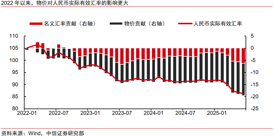 ▍按实际有效汇率衡量,2022年以来中国一篮子商品相对于海外的价格便宜了约19.5%,其中6.2ppts是因为名义汇率贬值,13.4ppts是因为境内外的通胀差。