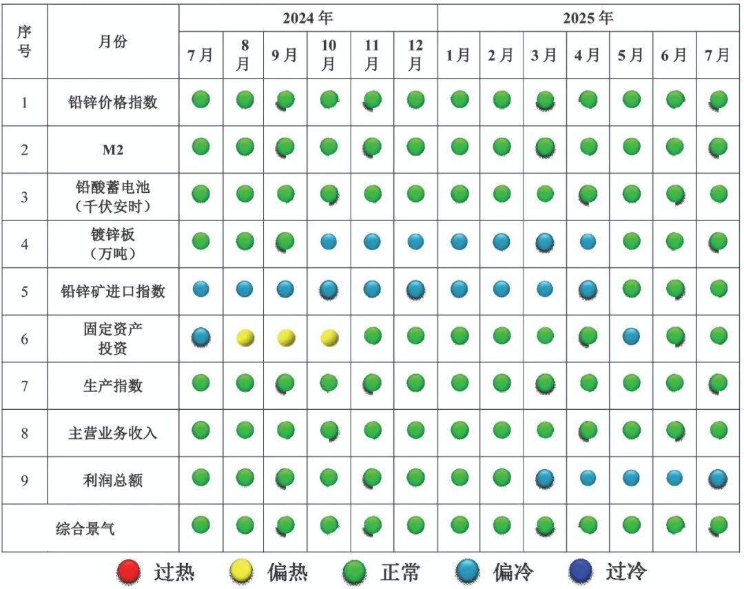 4. 综合景气指数反映当前铅锌产行发展景气程度。景气灯号图把铅锌产业经济运行状态分为5个级别,“红灯”表示经济过热,“黄灯”表示经济偏热,“绿灯”表示经济运行正常,“浅蓝灯”表示经济偏冷,“蓝灯”表示经济过冷。对单项指标灯号赋予不同的权重,将其汇总而成的综合景气指数也同样由5个灯区显示。