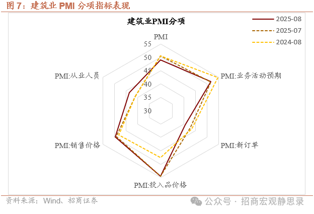8月三大部门PMI涨跌分化,服务业PMI升至年内最高点,制造业仍处于荣枯线下方,建筑业环比下跌幅度偏大,处于历史同期最低位。