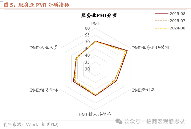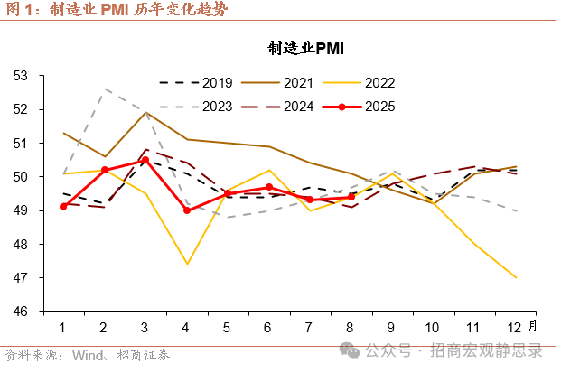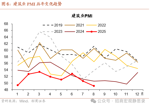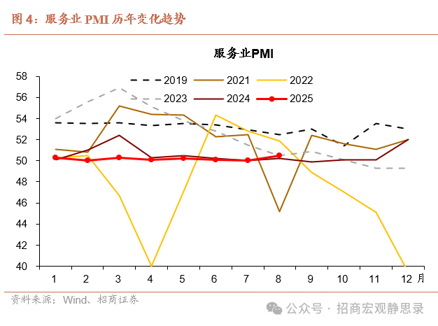 往后看,一是,进入9月后,高温多雨极端天气影响将逐渐消退,施工作业和户外行动将恢复正常,届时建筑业PMI或有所改善。二是,9月国内制造业正值秋旺季,叠加外部需求出现改善,预计制造业PMI会季节性反弹至临近点附近;当前反内卷仍在持续推进,尽管会导致部分行业开工率超季节性下跌,但通过提振上下游价格、改善企业利润或更有利于促进内需企稳回升。此外,当前国内正处新一轮牛市行情之中,财富效应有望提振服务消费成为下一阶段服务业的增长支撑。