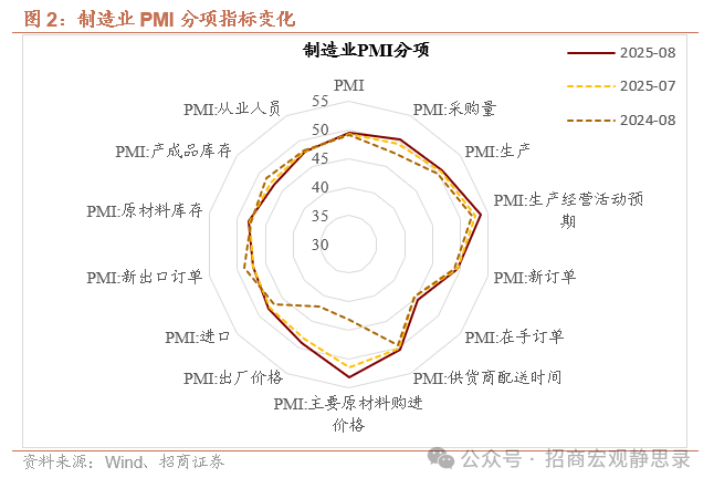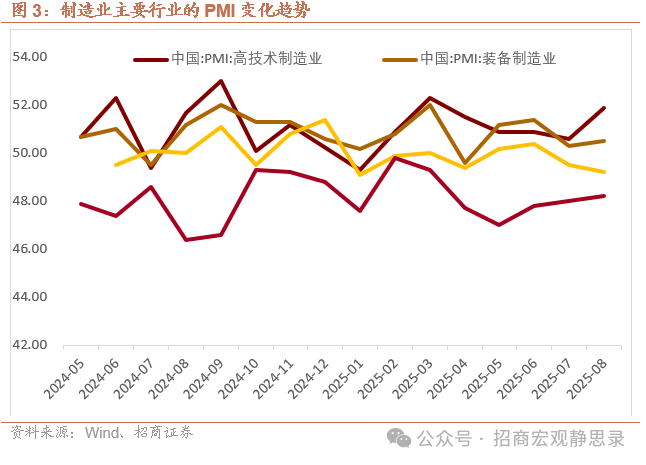 1)制造业,8月制造业PMI较上月提升0.1至49.4,制造业淡季上涨有两点原因:一是,反内卷带来的价格回升推动企业信心有所修复,叠加中美关税协议如期展期、海外制造业PMI回升继续提振国内出口,进而拉动订单、生产指数回升;二是,8 月正处进入制造业备采季,后衔接秋旺季,历史数据来看,8月多数情况下强于7月,且今年7月如期下行,8月回稳空间显得相对充足。尽管如此,8月高频数据显示,当前持续推进的“反内卷”在推高原材料及产成品价格的同时,也对部分行业生产造成约束,进而掣肘了PMI回升幅度,截至目前,制造业PMI已连续5个月处在荣枯线下方。分项来看,与上月相比,除产成品库存、从业人员指数出现下跌外,其他各项指数均有所回升。订单类指数虽有小幅回升,但仍处荣枯线之下,需求收缩问题仍然突出,受此影响,中小企业生产指数仍处荣枯线之下。本月价格的上涨或表明整治内卷式竞争已初见成效,但是原材料、产成品价格差较上月再度扩大,表明上下游价格传导仍存在阻塞,或不利于后续企业利润修复。此外,企业产成品指数出现较大幅度下跌,且明显高于生产指数回升幅度,或显示当前企业可能更倾向于消耗现有库存、观望情绪依然较强。分行业环比变动来看,中游高技术制造业>中游装备制造业>中游基础原材料行业>下游消费品制造业。