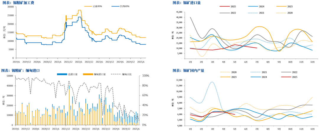 锡精矿加工费相较7月继续持平,云南、江西分别为12000元/吨、8000元/吨,短期矿端供应依然难见恢复;